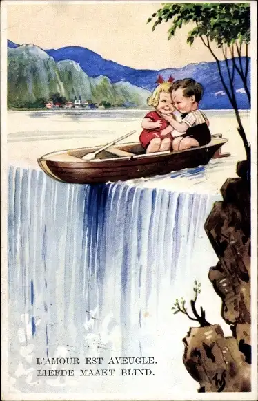 Künstler Ak Scheuermann, Willi, Liebespaar in einem Boot, Absturz vom Wasserfall