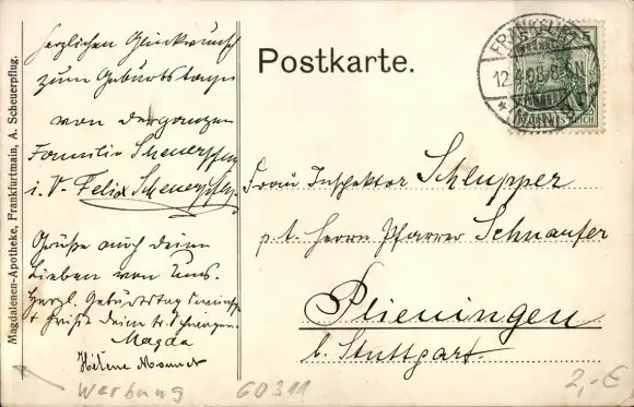 Zustand, siehe Scan, gelaufen, 1908 - Magdalenen-Apotheke A. Scheuerpflug - ca 14 cm X 9 cm