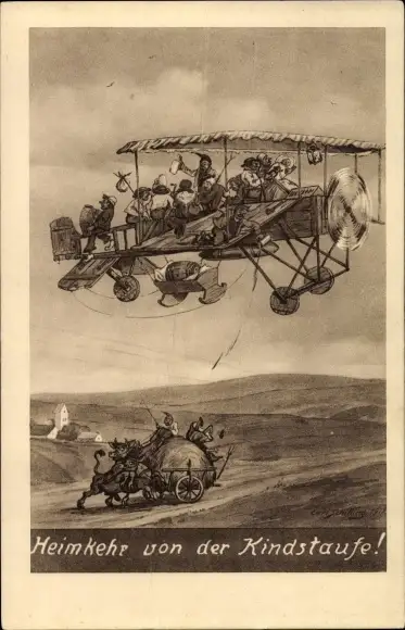 Künstler Ak Schilling, Carl, Heimkehr von der Kindstaufe, Doppeldecker