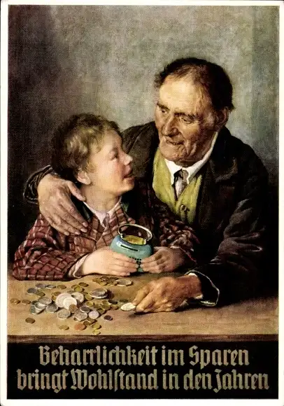 Künstler Ak Schlegel, K. A., Sparen bringt Wohlstand, Junge gewohnt, alt getan, Münzen, Sparkasse