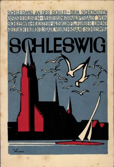 Künstler Ak Schleswig an der Schlei, Kirche, Segelboot, Möwen