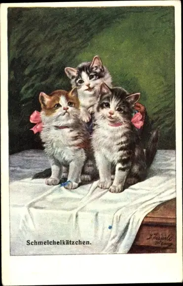 Künstler Ak Schmeichelkätzchen, Drei kleine getigerte Katzen