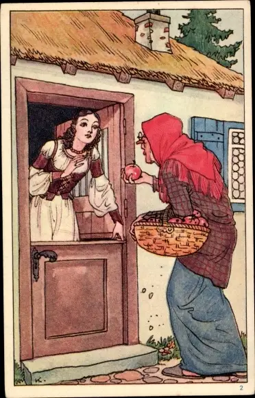 Künstler Ak Schneewittchen, Hexe mit Apfel, Märchen, Gebrüder Grimm