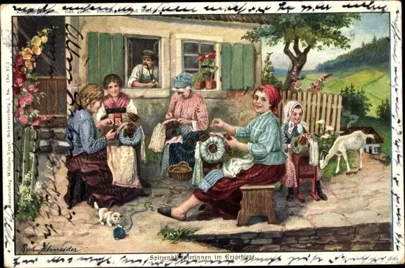 Künstler Ak Schneider, Rud., Spitzenklöpplerinnen im Erzgebirge, Ziege