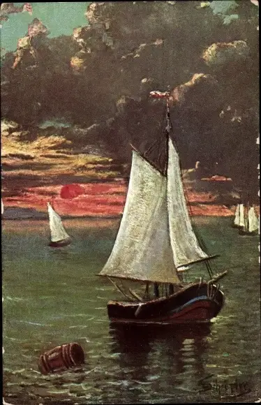 Künstler Ak Schröpler, Boote auf dem Meer, Sonnenuntergang