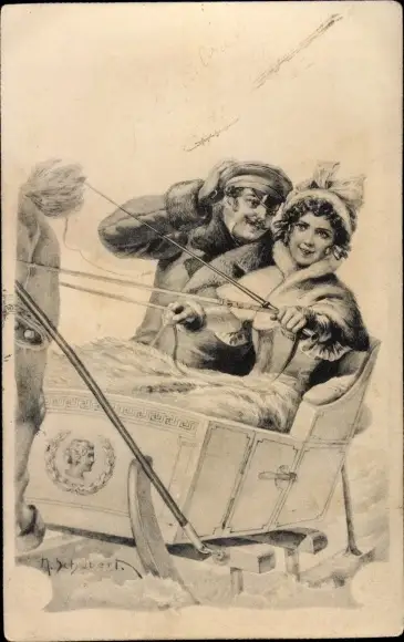 Künstler Ak Schubert, A., Paar in einem Pferdeschlitten, Schlittengespann