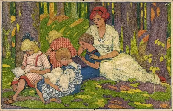 Künstler Ak Schweiz, Kinder und Frau lesend auf einer Wiese, Für die Jugend