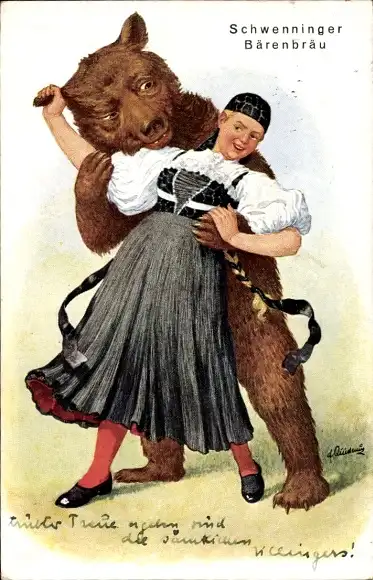 Künstler Ak Schwenninger Bärenbräu, Frau in Tracht mit Braunbär, Reklame