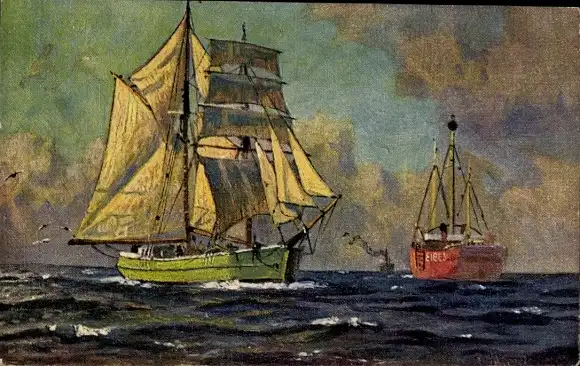 Künstler Ak Segelschiff und Frachtschiff auf dem Meer