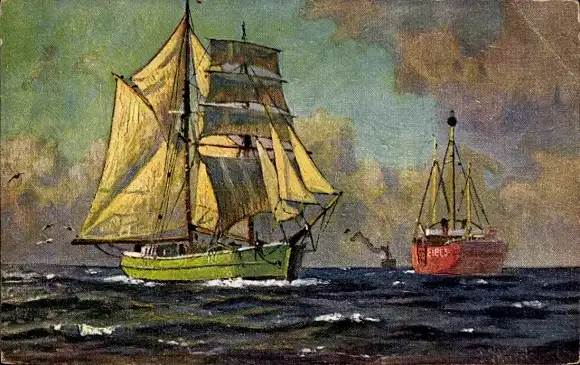 Künstler Ak Segelschiff und Frachtschiff auf dem Meer