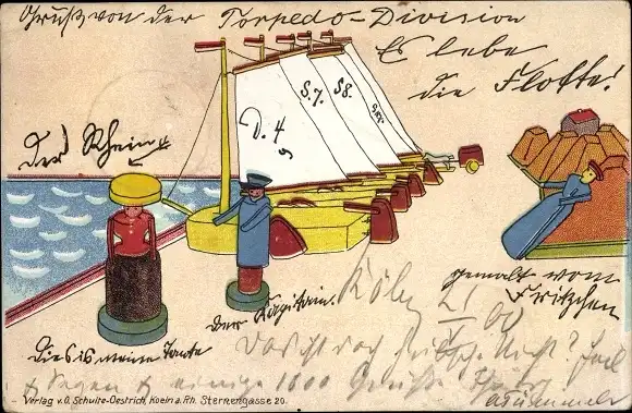 Künstler Ak Segelschiffhafen aus Holz, Spielfiguren