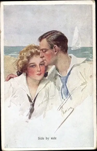 Künstler Ak Side by side, Liebespaar, Matrose, Strand, Meer
