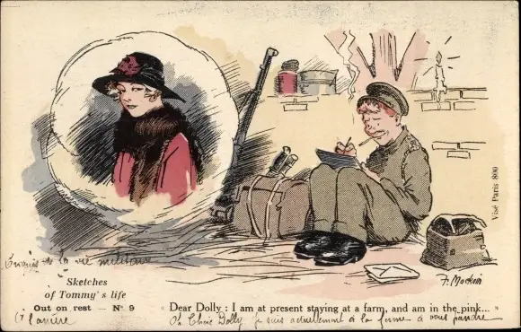 Künstler Ak Sketches of Tommy's life, britischer Soldat schreibt Brief an eine Frau