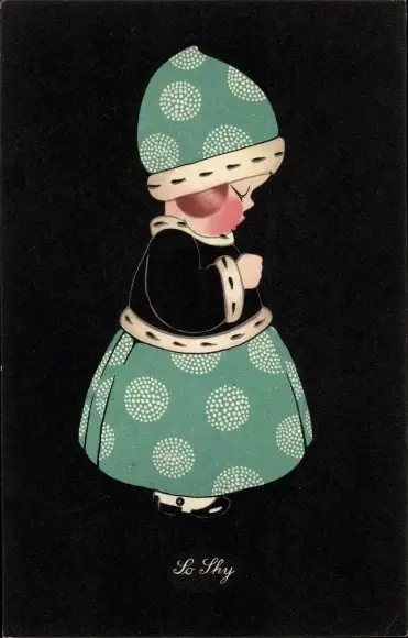 Künstler Ak So Shy, Mädchen in grünem Kleid mit Mütze