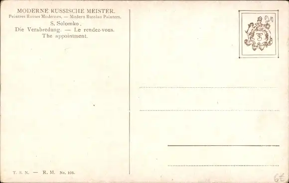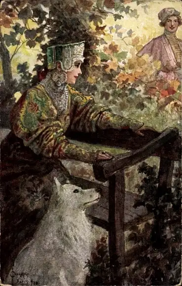 Künstler Ak Solomko, S., Die Verabredung, Frau in Tracht, Hund