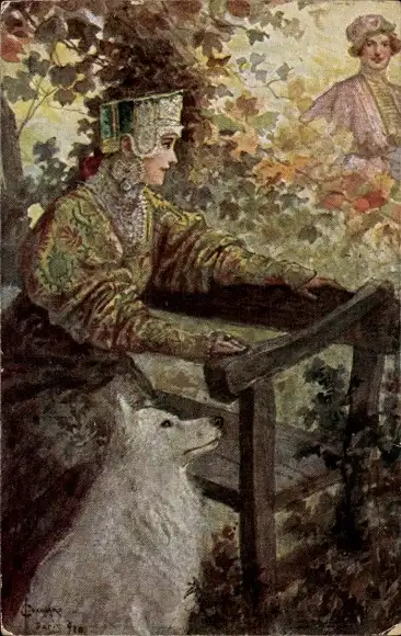Künstler Ak Solomko, S., Verabredung, Frau in Tracht, Hund