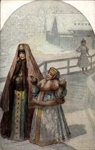 Künstler Ak Solomko, S., Verehrer, Frauen in Volkstrachten