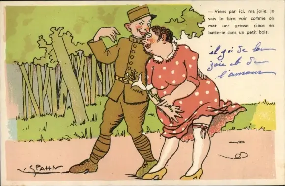 Künstler Ak Spahn, Französischer Soldat mit dicker Frau