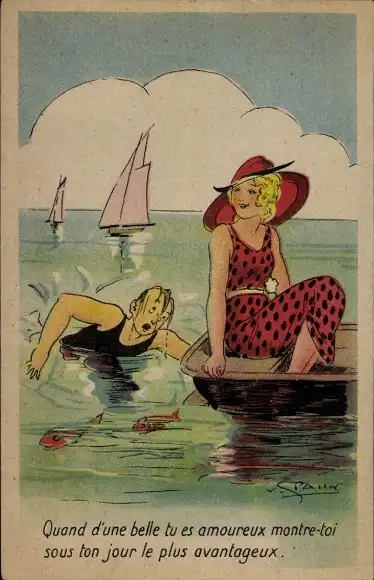Künstler Ak Spahn, Mann schwimmt einer Frau im Ruderboot hinterher