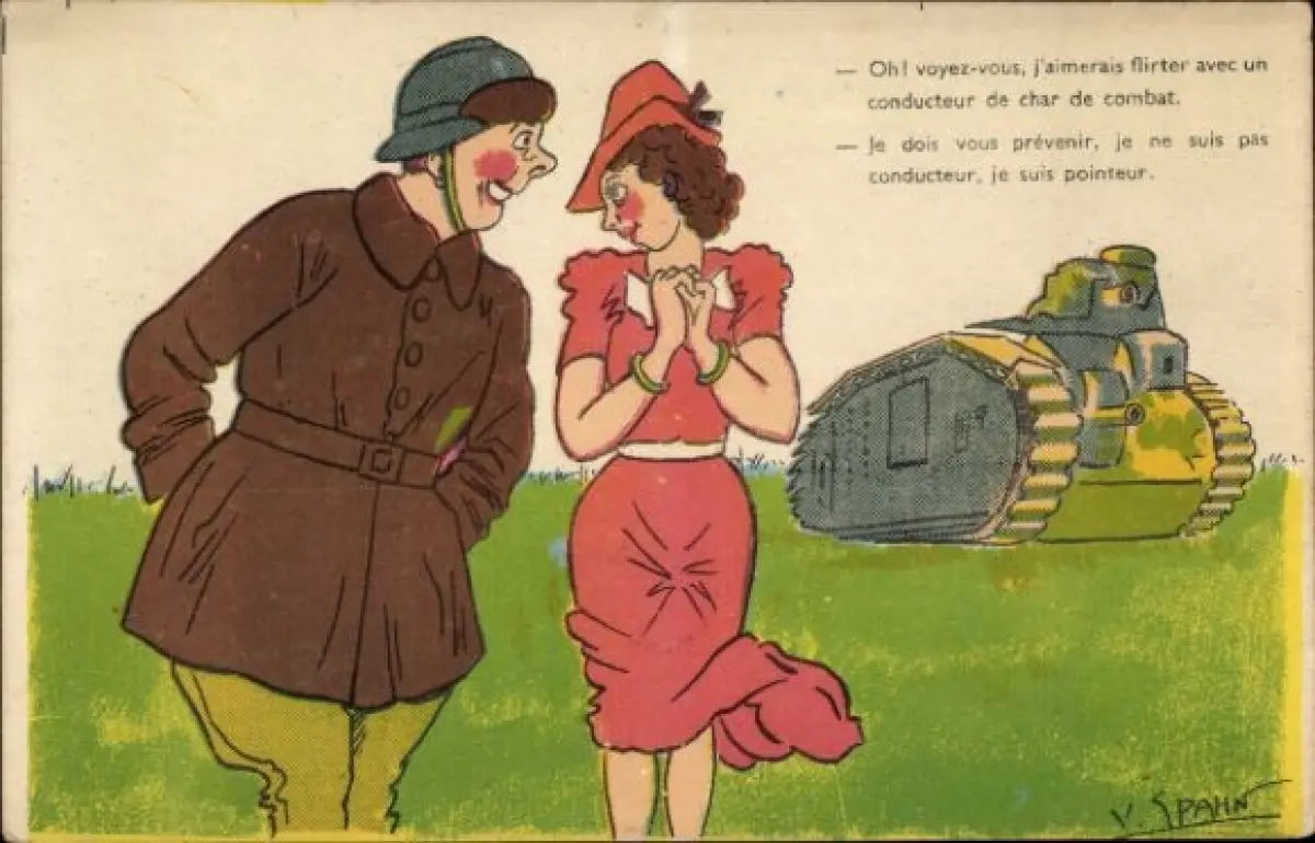 Künstler Ak Spahn, Soldat flirtet mit einer Frau, Panzer