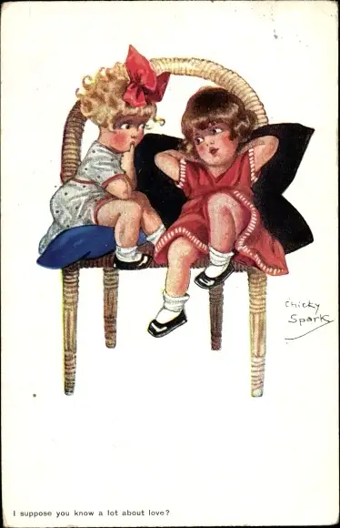 Künstler Ak Spark, Chicky, Zwei Mädchen auf einem Korbstuhl, I suppose you know a lot about love
