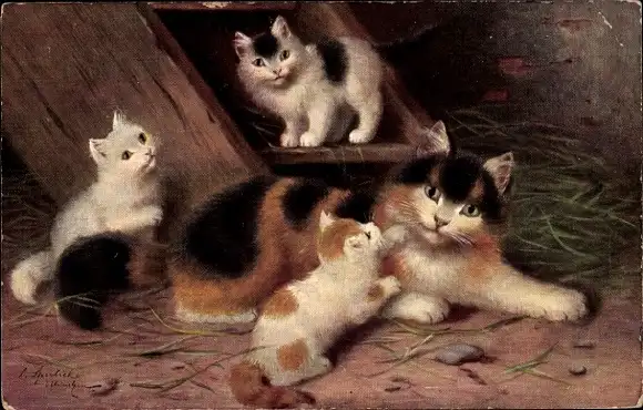 Künstler Ak Sperlich, Katzenmutter mit Kindern