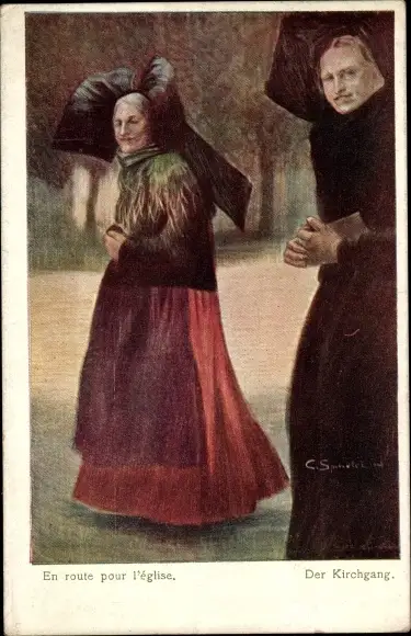 Künstler Ak Spindler, C., En route pour l'eglise, Frauen in Elsässer Trachten