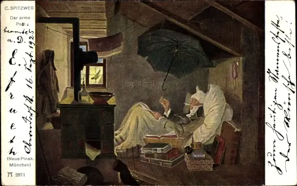 Künstler Ak Spitzweg, Carl, Der arme Poet, Regenschirm, Bücher