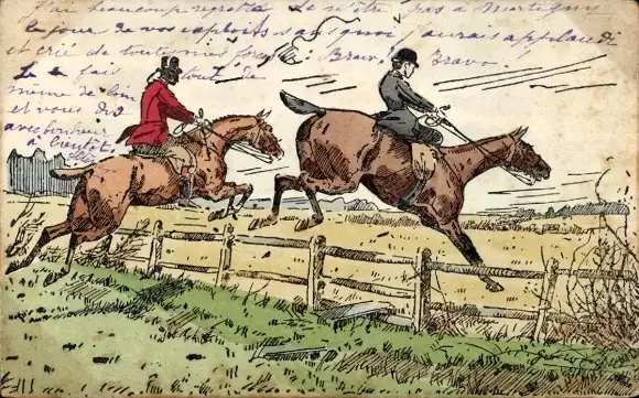 Künstler Ak Springreiten, Jockeys zu Pferden, Zaun, Sprung