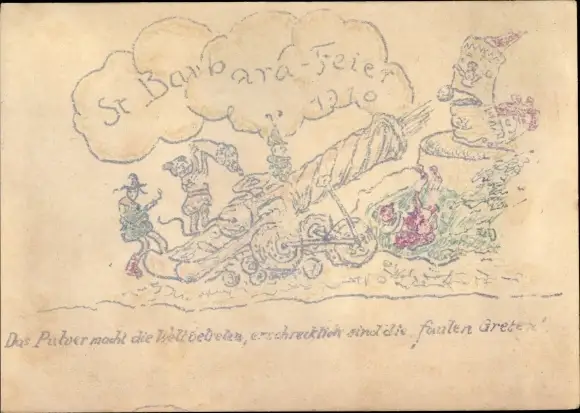 Künstler Ak St. Barbarafeier 1910, Bergbau, Kanone wird abgeschossen