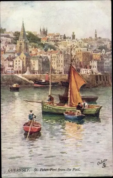Künstler Ak St. Peter Port Guernsey Kanalinseln, View from the Pool, Fischerboote