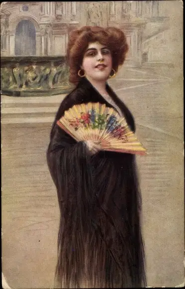 Künstler Ak Standportrait einer Frau mit Fächer