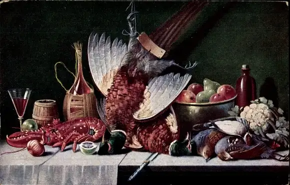 Künstler Ak Stillleben, gedeckter Tisch mit Fasan, Hummer, Tauben, Früchte