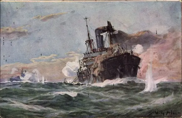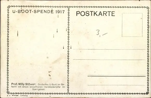 Künstler Ak Stöwer, Willy, Deutsches U Boot im Gefecht mit einem Handelsdampfer im Sperrgebiet