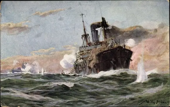 Künstler Ak Stöwer, Willy, Deutsches U Boot im Gefecht mit einem Handelsdampfer im Sperrgebiet