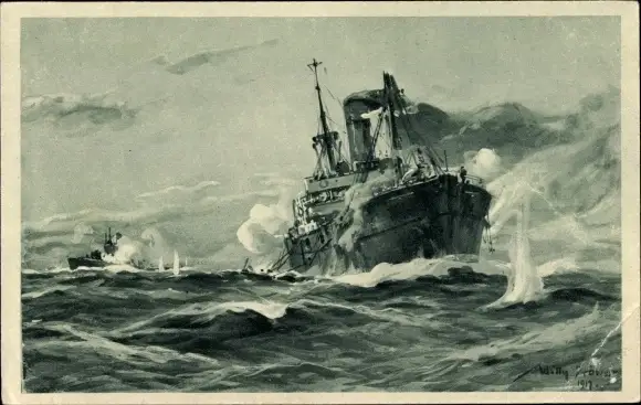 Künstler Ak Stöwer, Willy, Deutsches U Boot im Gefecht mit einem Handelsdampfer im Sperrgebiet