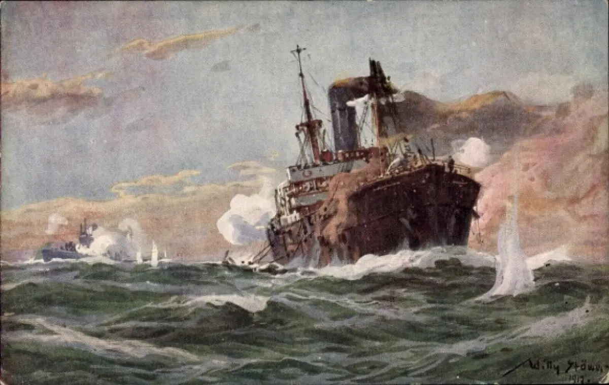 Künstler Ak Stöwer, Willy, Deutsches U Boot im Gefecht mit einem Handelsdampfer im Sperrgebiet