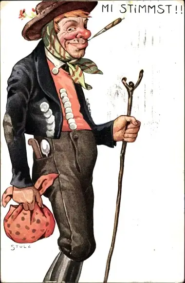 Künstler Ak Stolz, Mi Stimmst, Wanderer, Knöpfe, Knappsack