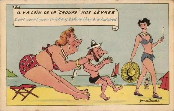 Künstler Ak Strandleben, Mann schaut junger Frau im Bikini hinterher