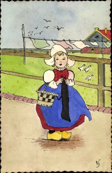 Künstler Ak Strickendes Mädchen in niederländischer Tracht