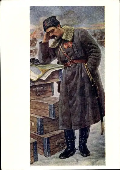 Künstler Ak Strunnikov, Rauchender russischer Soldat, Mantel