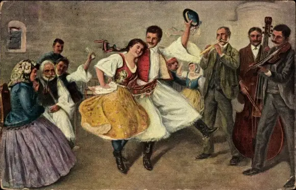 Künstler Ak Tänzerpaar in ungarischen Tracht, Musikanten, BKWI 546-3