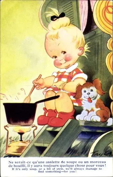 Künstler Ak Taylor, Mädchen am Kochen, If it's only soup, or a bit of stew