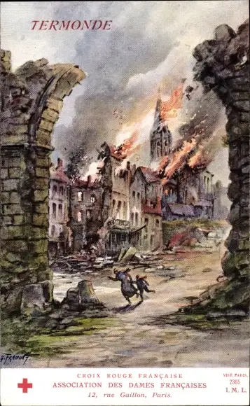 Künstler Ak Termonde Dendermonde Ostflandern, Brennende Häuser