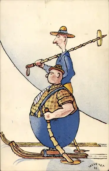 Künstler Ak Thevenet, dicker und dünner Mann auf Skiern