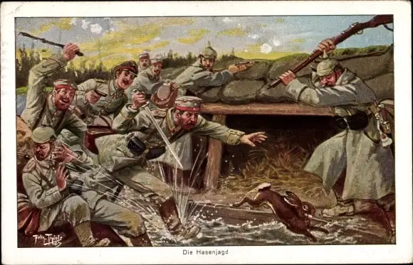Künstler Ak Thiele, Arthur Die Hasenjagd, Soldaten jagen Hasen im Unterstand, I. WK