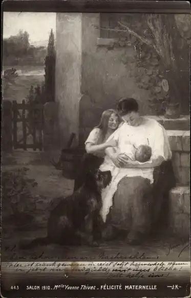 Künstler Ak Thivez, Mutterglück, Mutter mit Baby im Arm, Hund