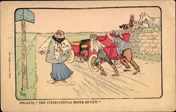 Künstler Ak Thor, Männer schieben ein Automobil, Pferde schauen zu, International Motor Review