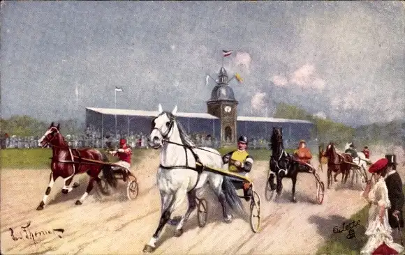 Künstler Ak Trabrennen, Zuschauer, Pferderennbahn
