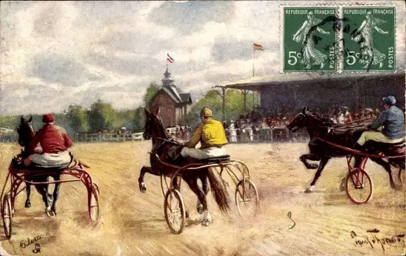 Künstler Ak Trabrennen, Zuschauer, Pferderennbahn